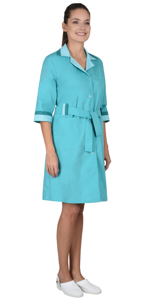 Халат прямого силуэта с центральной бортовой застежкой на пуговицы, с отложным лацканом и воротником. По линии талии проходит пояс, завязывающийся спереди. Воротник, манжеты, шлёвки из отделочной ткани.