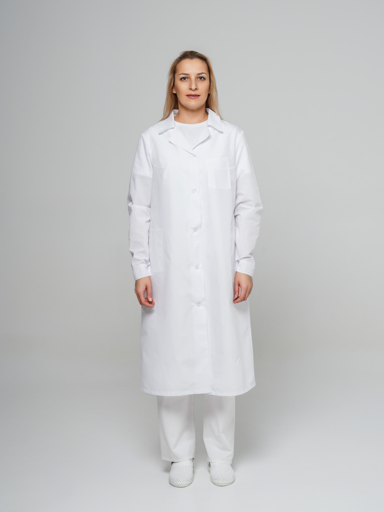 Халат рабочий женский №203 отбеленный, ткань ТИСИ (ЧЗ) (112-116/182-188)