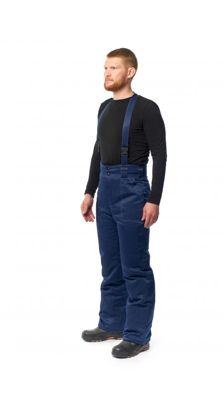 Брюки с притачным поясом, с застежкой-гульфиком на петли и пуговицы. На передней части брюк расположены накладные карманы. Пояс фигурный в области спинки, с бретелями с эластичной тесьмой. Световозвращающие полосы шириной 50 мм по линии груди и на спине.