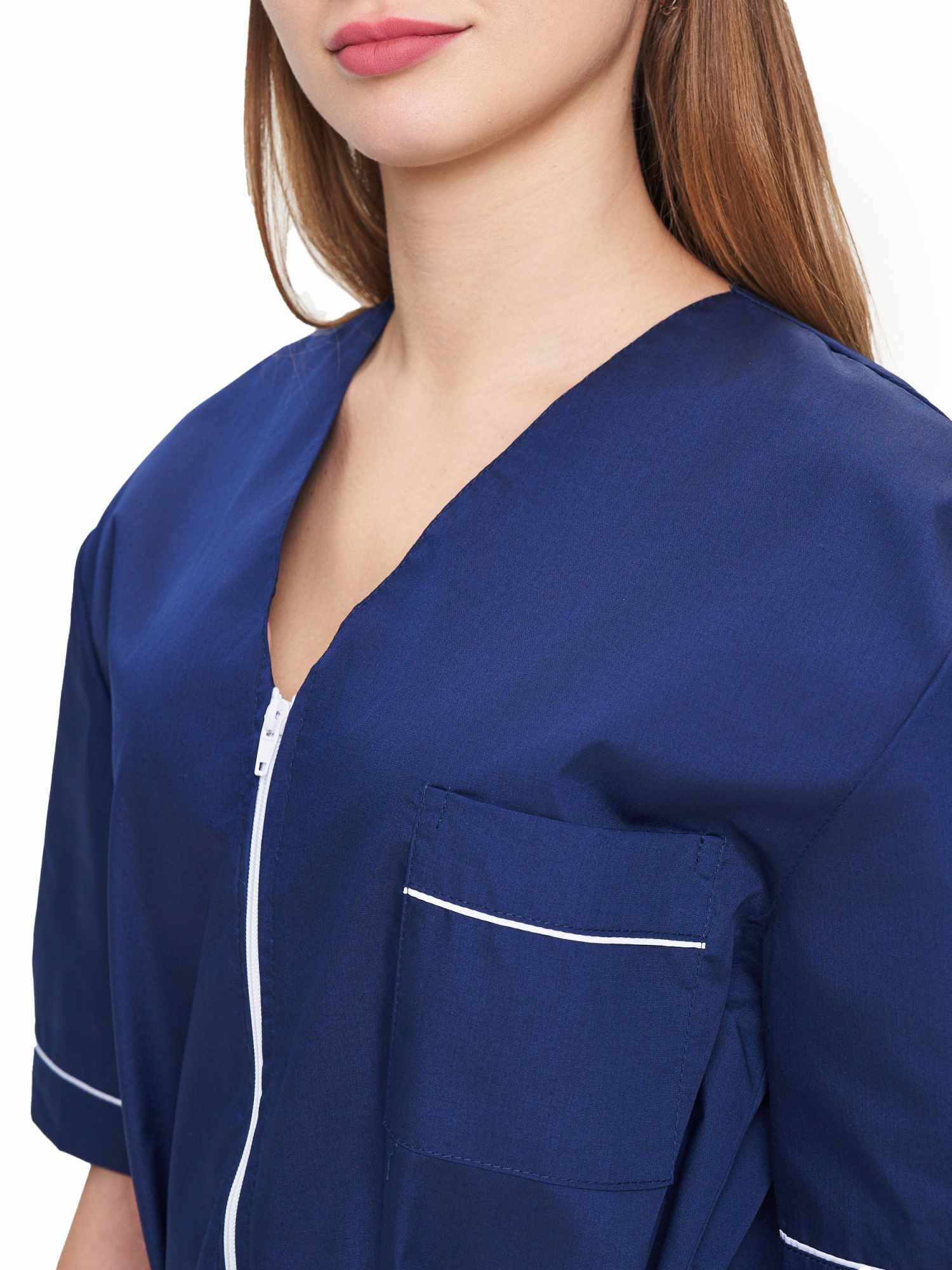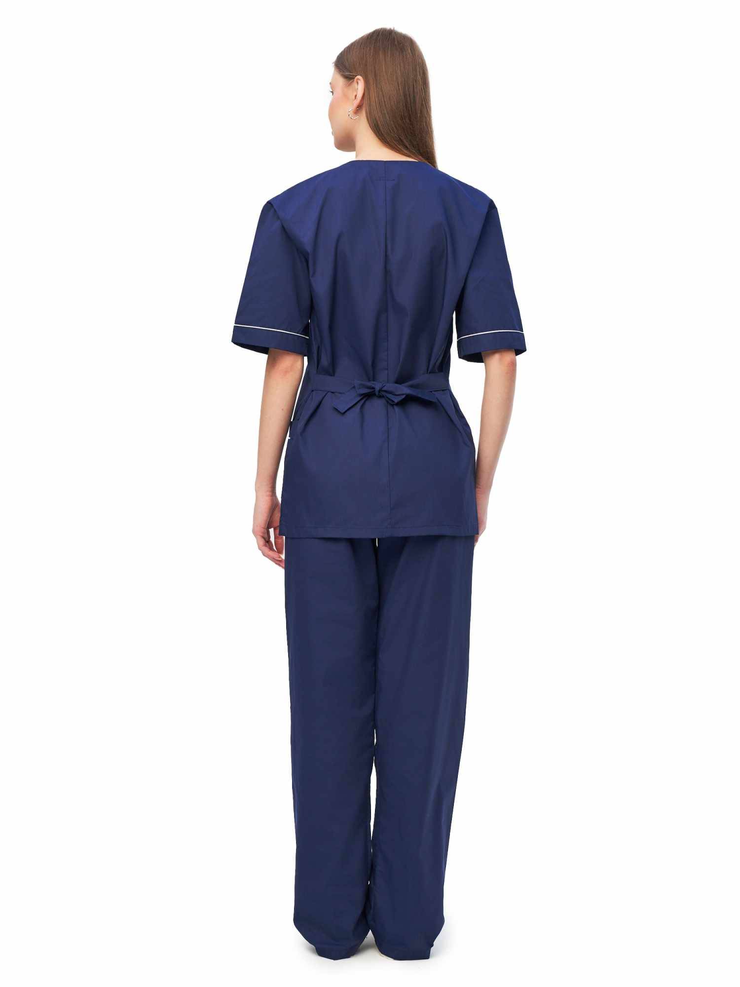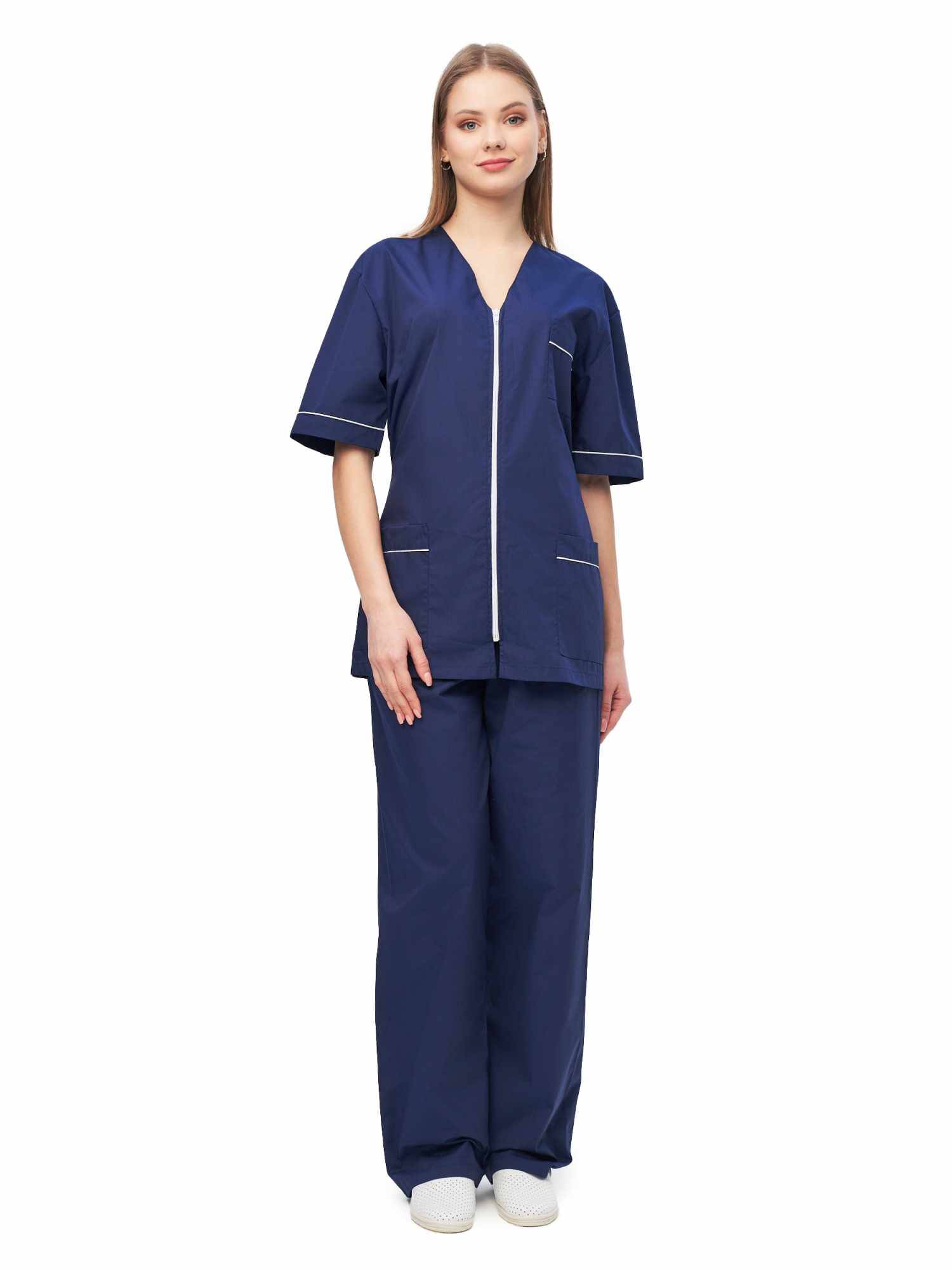 Современный удобный женский костюм со свободной посадкой, рекомендован для сферы косметологии и работников медицинских учреждений из высококачественной смесовой ткани прекрасно переносят многократные стирки и выглядят презентабельно даже при длительных сроках эксплуатации. Широкий размерный ряд продукции позволит без труда подобрать костюм правильно по фигуре, в соответствии со спецификой профессии и с учетом индивидуальных требований сотрудника. Костюм женский «Глория» для косметологов и медработников прост в уходе, не мнется и быстро сохнет, а материал долгое время сохранит свой первоначальный яркий цвет. Костюм состоит из блузы и брюк темно-синего цвета с белой отделкой. Сегодня современная мода вмешивается не только в подиумные и уличные образы. Она диктует свои правила разным сферам жизни, в том числе в сфере косметологии и медицине. Костюм состоит из прочной смесовой ткани ТИСИ, отталкивающей различного рода загрязнения. Материал устойчив к пятнам и истиранию, тем самым косметологи и медработники всегда будут выглядеть опрятно и привлекательно.