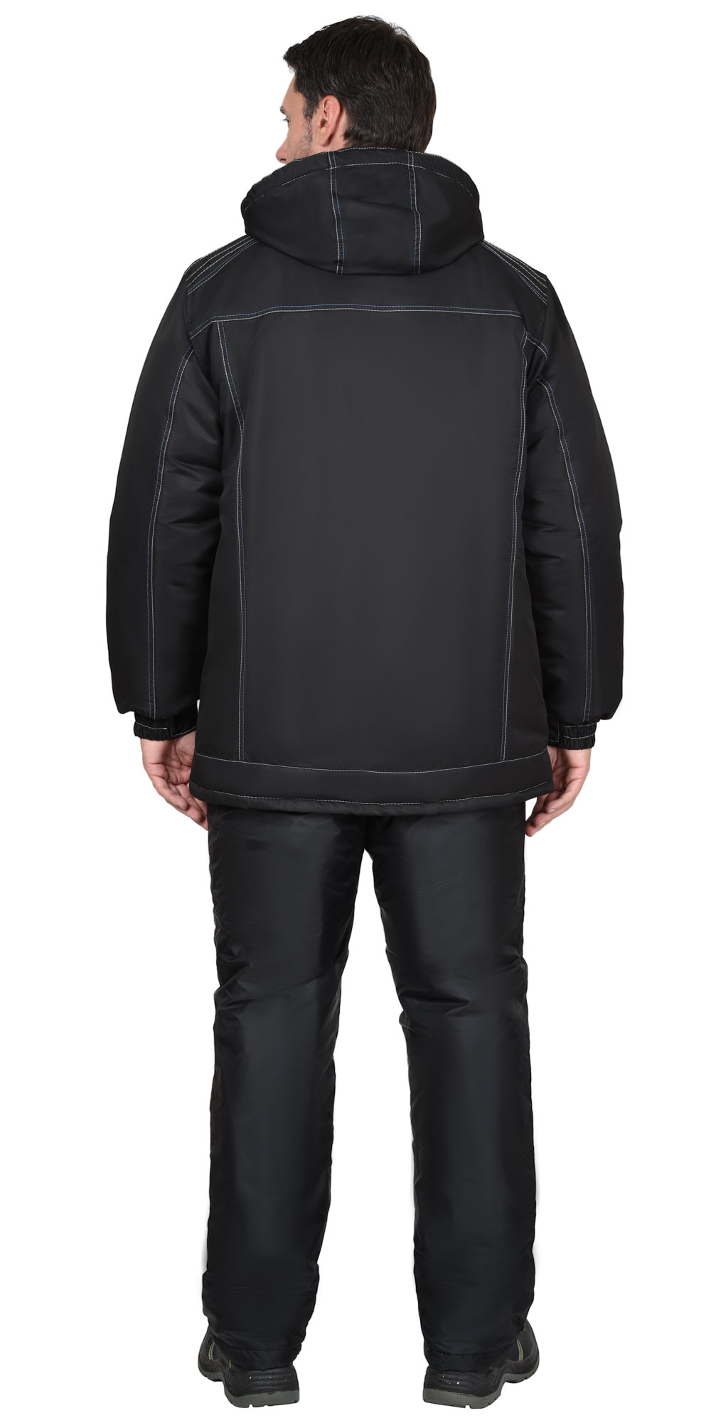 Куртка длинная, прямого силуэта, с притачной утеплённой подкладкой и съёмным капюшоном, с воротником-стойка, с центральной бортовой застёжкой на тесьму - «молния», с ветрозащитной планкой застегивающейся на ленту «контакт» и с подпланкой, с верхним и нижними прорезными карманами. Рукава втачные с манжетами, частично стянутыми на резинку, на левом рукаве карман на тесьму – «молния», с внутренним карманом с молнией. Куртка с контрастными кантами по карманам и воротнику