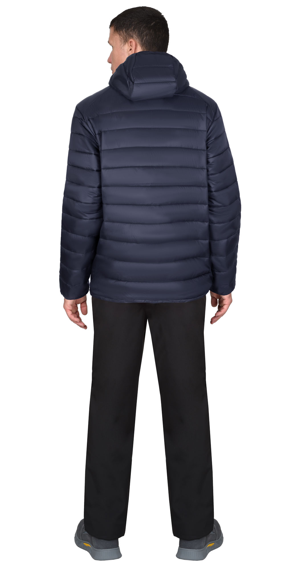 Куртка, утепленная из стёганного полотна, с центральной бортовой застёжкой молния, с втачным капюшоном, с общей кокеткой полочек и спинки, с втачными рукавами, с карманами на молнии в шве рельефа, с удлинённой фигурной линией низа на спинке. Низ куртки, низ рукавов и лицевой вырез капюшона окантованы эластичной тесьмой.
