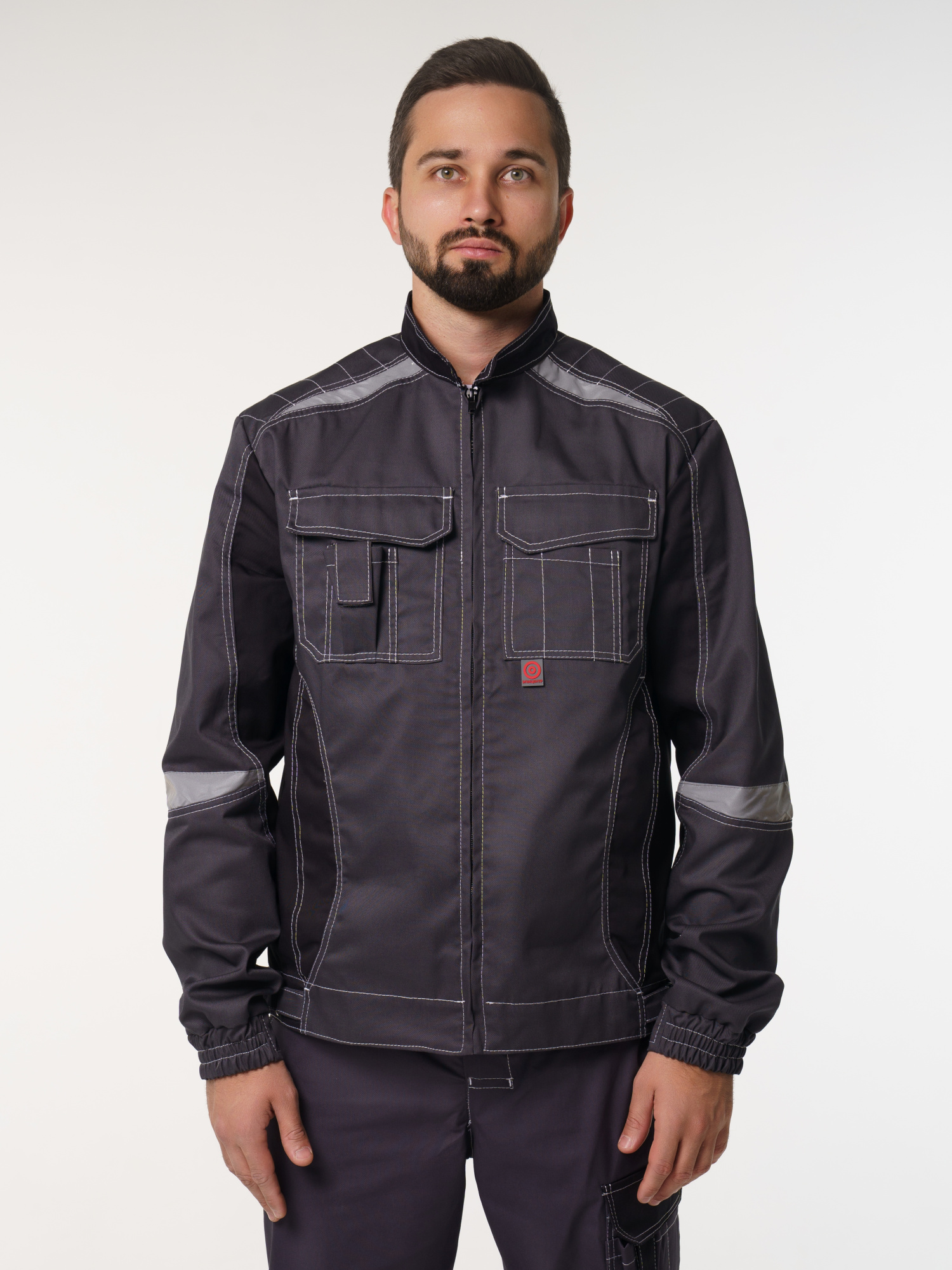 Куртка прямого силуэта; короткая; воротник стойка; с центральной застёжкой на молнию; с верхними фигурными карманами с фигурными клапанами; низ регулируется при помощи хлястиков с полукольцами. На куртке есть СВ элементы.