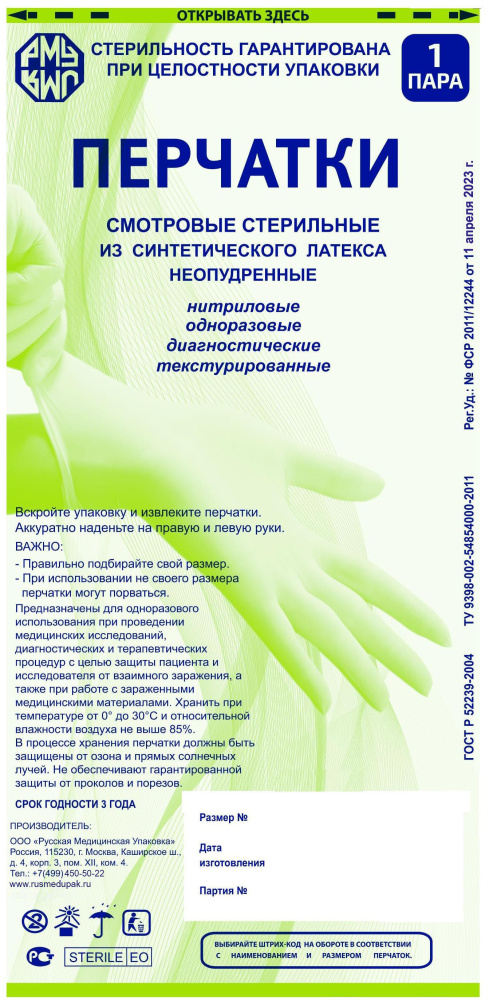Перчатки стерильные смотровые нитриловые неопудренные (Русмед упаковка) НДС 10% (L (9))