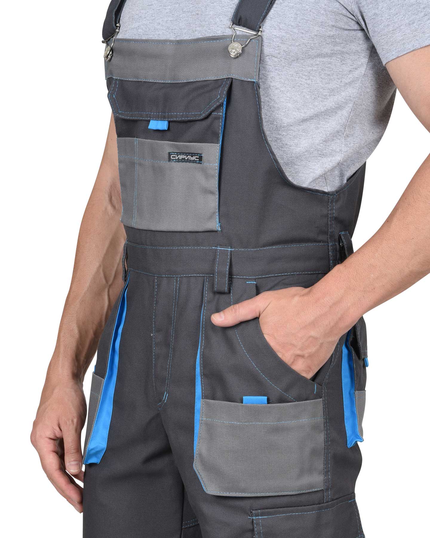 Полукомбинезон выполнен из ткани "Панакота Комфорт", с застежкой гульфика на молнию, застежкой в боковом шве на пуговицы, накладным объемным комбинированным карманом на нагруднике с фигурным клапаном, застегивающимся на липучку. Изделие с нижними боковыми накладными комбинированными объемными карманами с наклонным входом, с накладным объемным карманом и фигурным клапаном на правом боковом шве, застегивающимся на липучку, с объемными наколенниками, с задними накладными объемными карманами и комбинированным карманом для инструмента. В области талии по всей ширине с изнаночной стороны вставлена резинка для лучшего прилегания.