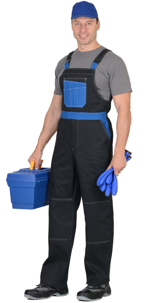 Полукомбинезон прямого покроя; с притачным нагрудником; с наколенниками; с накладным комбинированным фигурным карманом с фигурным клапаном на нагруднике; с боковыми внутренними карманами; с накладным карманом на правой задней половинке п/к; с карманами для инструмента.